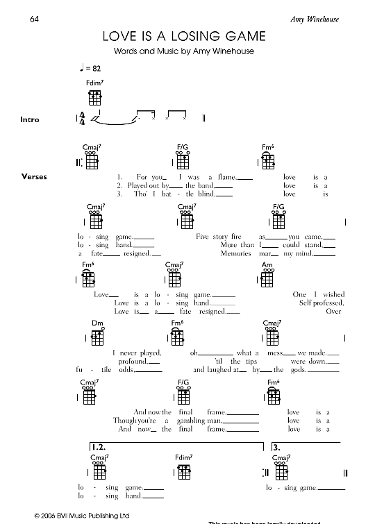 The official lyric video for Amy's song Love Is A Losing Game, released as a single on this day in 2007 Love is a Losing Game (Jools Holland 2009) Lyrics: For you, I was a flame / Love is a losing game / Five story fire as you came / Love is a losing game / One I wish I'd never played / Oh, what a. More than I could stand, love is a losing hand Self-professed, profound, 'til the tips were down Know you're a gambling man, love is a losing hand Though I'm rather blind, love is a fair resign Memories mar my mind, love it is a fair resign Over a few tiles, and laughter by the docks And now the final frame, love is a losing game Writer/s: Amy.